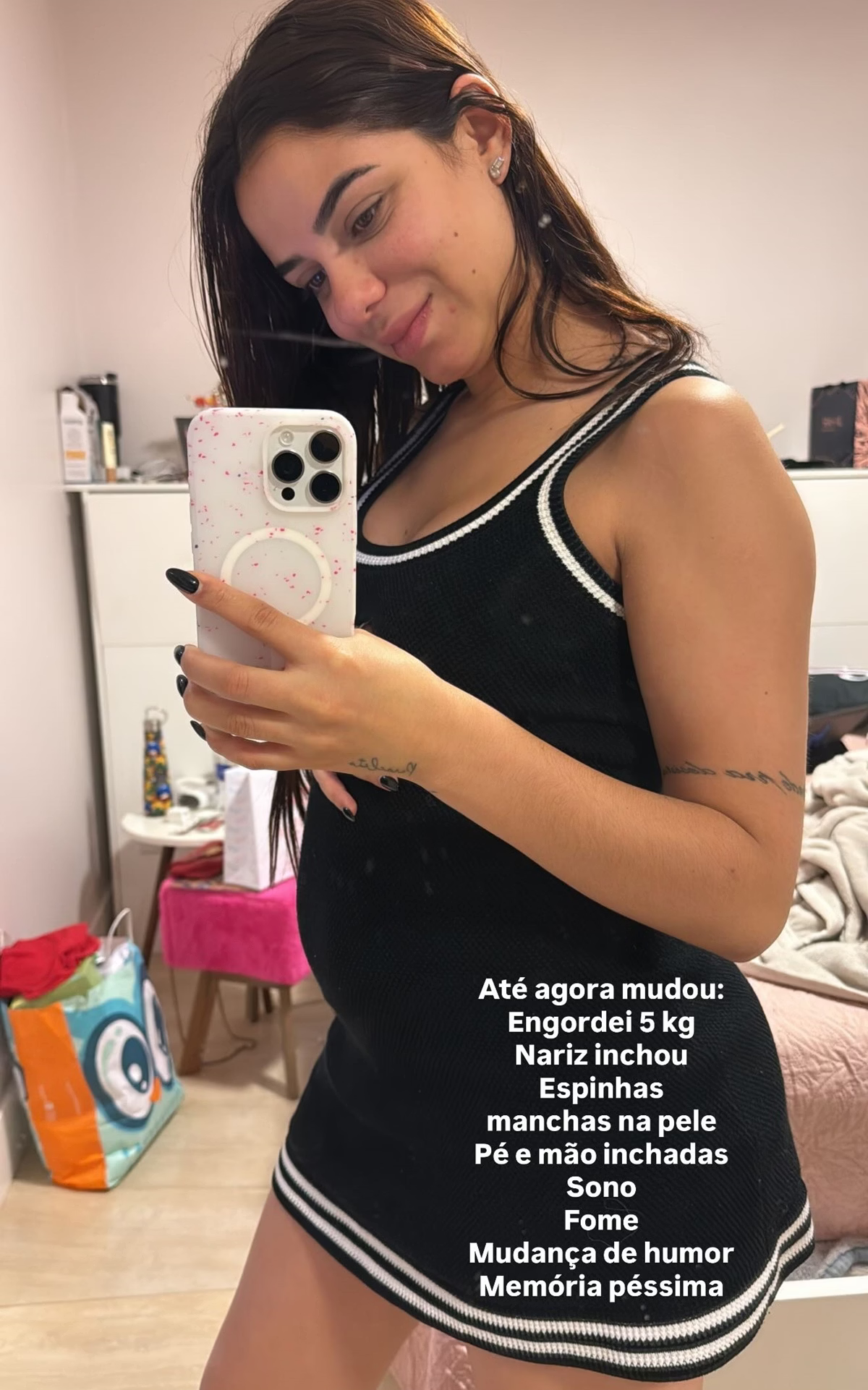 Com 15 semanas de gestação, Key tem mostrado com frequência nas redes sociais as transformações no corpo e os sintomas que vem enfrentando. Entre as mudanças, ela citou ganho de peso (já são 6 kg a mais), inchaço no nariz, manchas na pele, espinhas, sono excessivo, alterações de humor, memória fraca e até inchaço nas mãos e pés. Ela também comentou sobre dores de cabeça e insônia, que têm atrapalhado suas noites de sono.